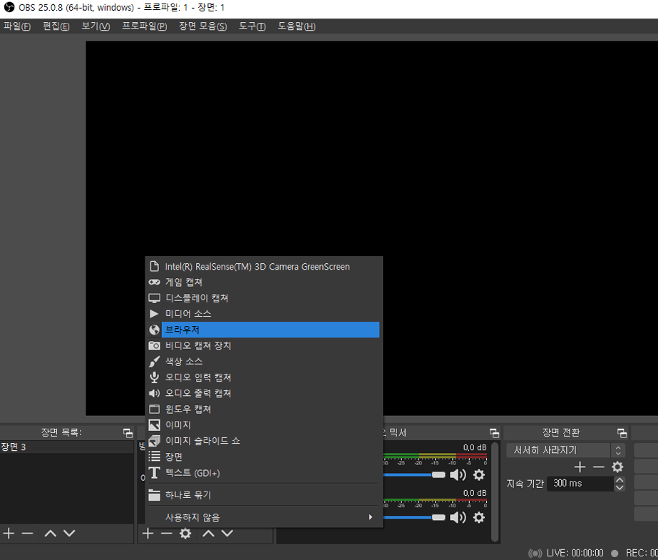 장면마다 소스들을 추가할 수 있습니다.