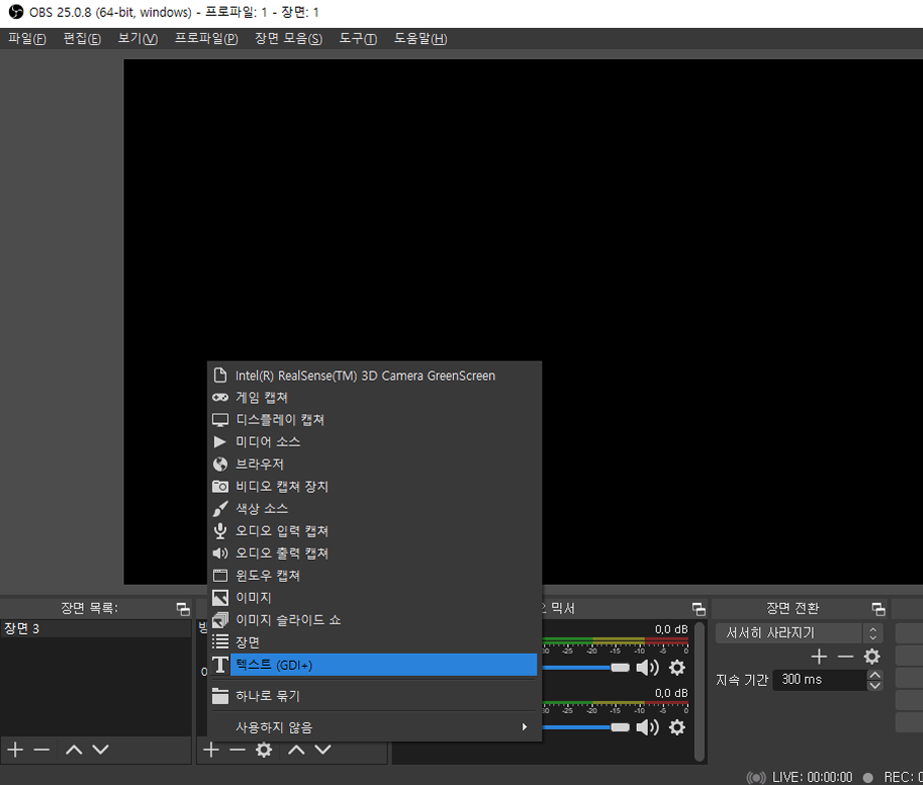 텍스트 소스는 자막과 같이 화면에 텍스트를 표시할 수 있는 기능입니다.