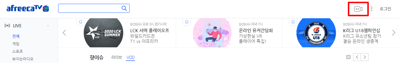 아프리카tv 홈페이지 "접속 -> 로그인" 후 우측 상단의 "방송하기(카메라 모양) 버튼"을 클릭하여 프릭샷을 설치 및 실행시켜줍니다.