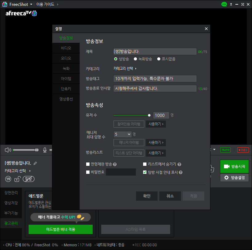 우측의 방송시작 버튼 아래 "방송설정" 버튼을 누르면 위와 같은 창이 뜨게 됩니다.