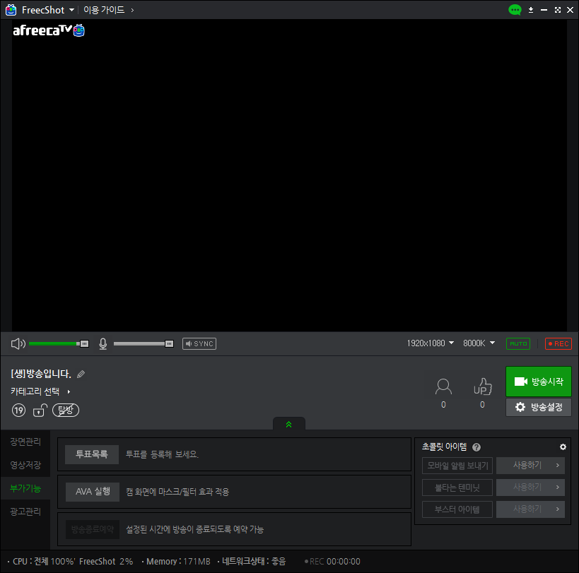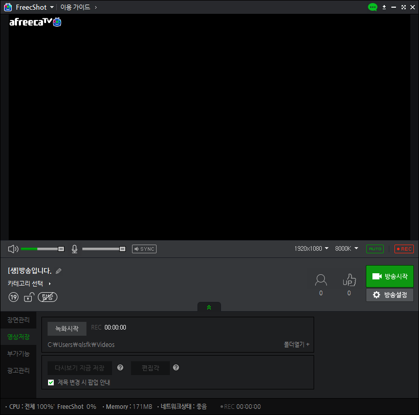 장면관리, 영상저장(녹화본 저장), 부가기능, 광고관리, PC 상태 등을 관리하고 확인할 수 있는 공간입니다. |