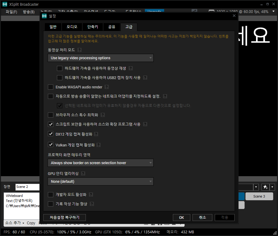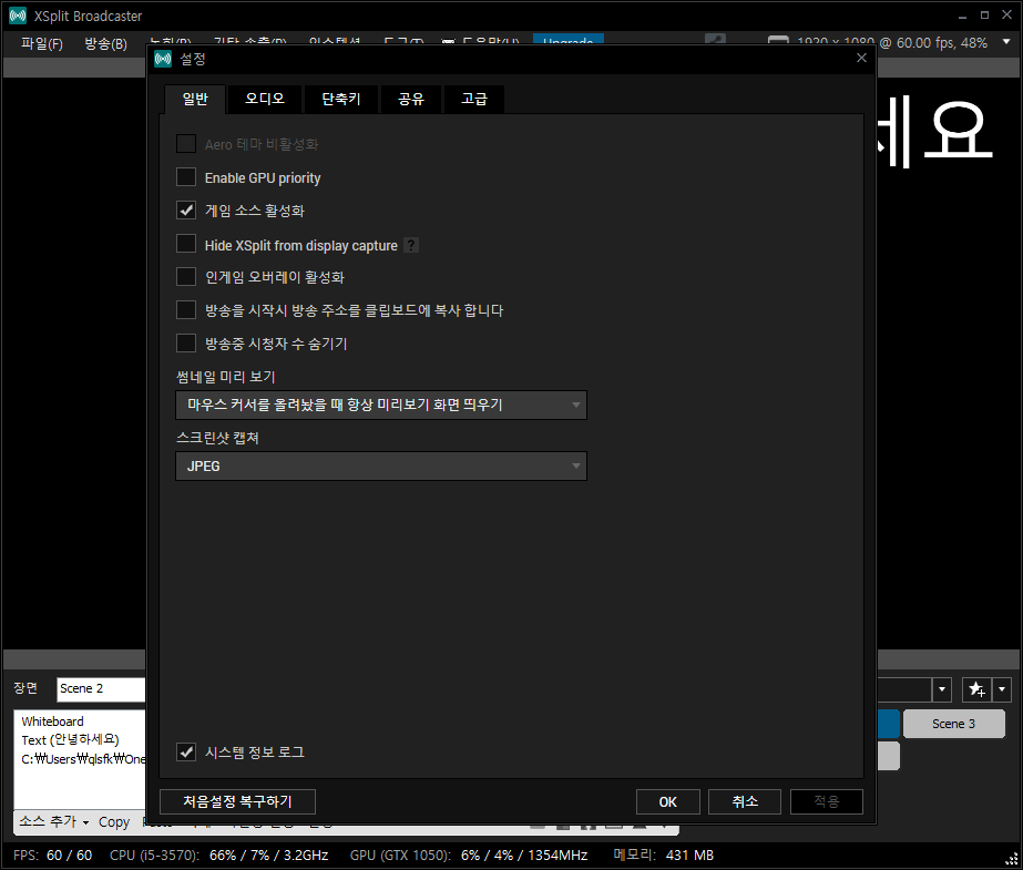 일반 설정은 게임 소스 활성화 정도만 체크해 줍니다.