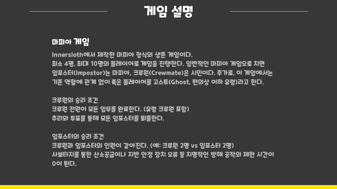 반대로 시민(크루원)은 마피아의 방해를 피해 미션을 모두 완료하거나 추리와 투표를 통해 마피아(임포스터)를 퇴출시켜야 한다.