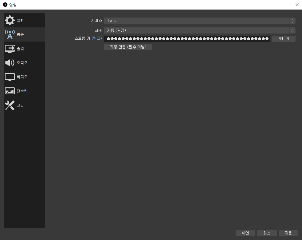 트위치를 예로 들었을 때 스트림 키 "(링크)" 를 눌러 페이지에 접속하거나