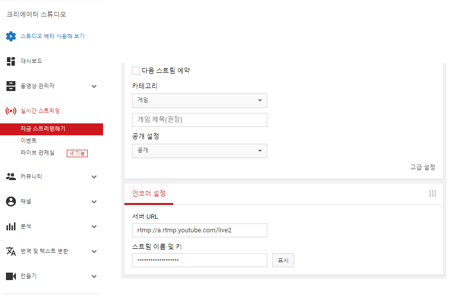 크리에이터 스튜디오 - 실시간 스트리밍 - 인코더 설정 - 스트림 이름 및 키 확인