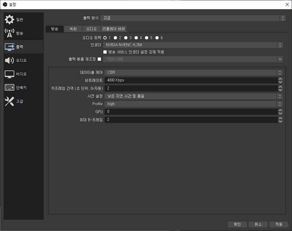 고급 설정은 OBS를 살짝 공부하고 건드는 게 좋습니다.