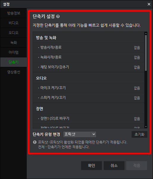 단축키 유형을 통해 프릭샷이 활성화되어 있을 때만 단축키를 적용할 수 있으며 전체를 선택하면 언제든 단축키만 누르면 실행될지 설정할 수 있습니다.