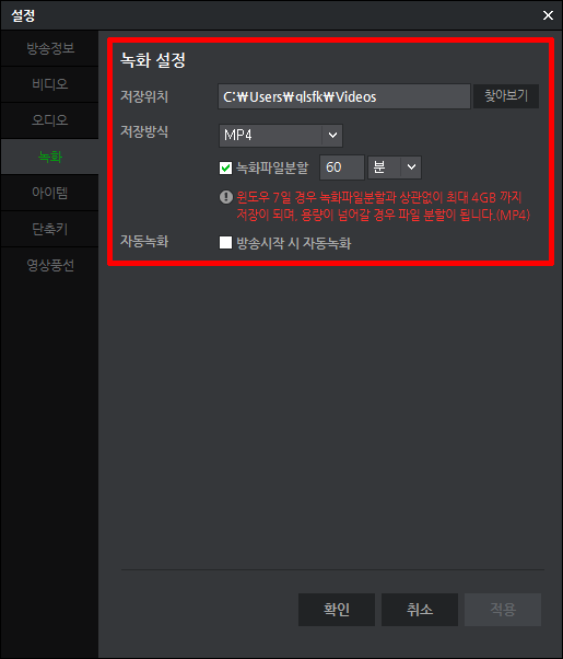 녹화 설정에서는 방송 녹화 파일 저장 위치, 저장방식 등을 설정할 수 있습니다.
