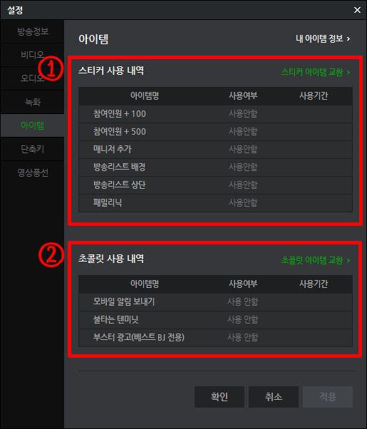 아프리카의 별풍선과 같은 유료 아이템인 스티커와 초콜릿을 사용해 방송에 유용한 기능들을 구매하고 설정할 수 있습니다.