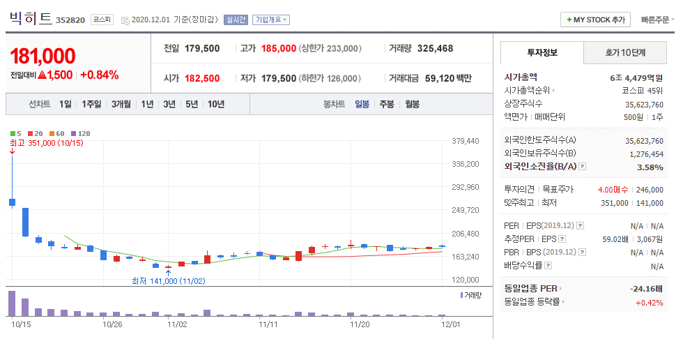 최근에 주식 상장해서 환불사태도 일어나고 했었는데 처음에 35만원대 찍고 현재는 18만원대 왔다리 갔다리 횡보하고 있네요.