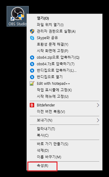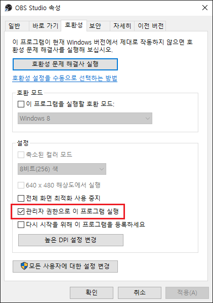 OBS Studio를 우클릭 - 속성 - 호환성 탭으로 간 후 "관리자 권한으로 이 프로그램 실행"을 체크 - 적용해주고 OBS를 실행합니다.