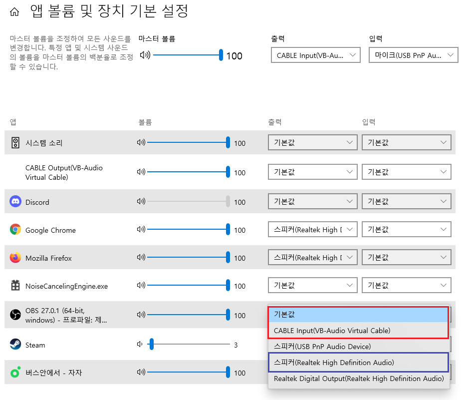 기본값(CABLE Input) = 라이브, 다시 보기 모두에 들어갈 소리 (게임 소리, 한국 노래, 노래가 아닌 영상 도네 또는 후원 등등)