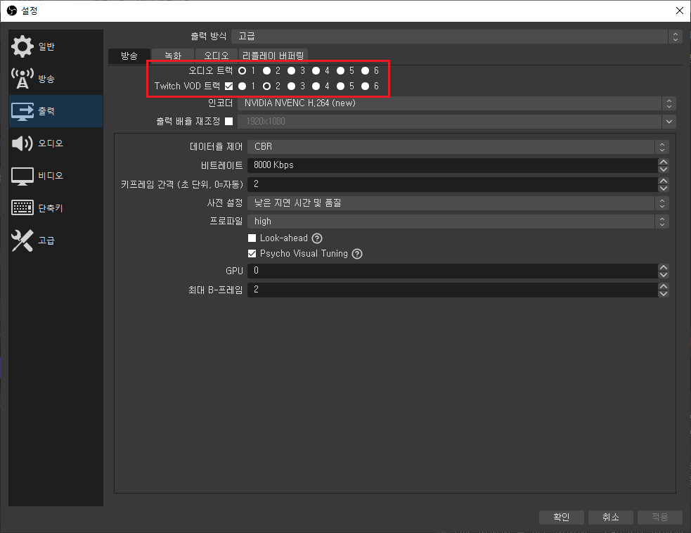 OBS를 실행하고 설정 - 출력으로 가면 방송 탭에 오디오 트랙과 Twitch VOD 트랙이 있습니다.