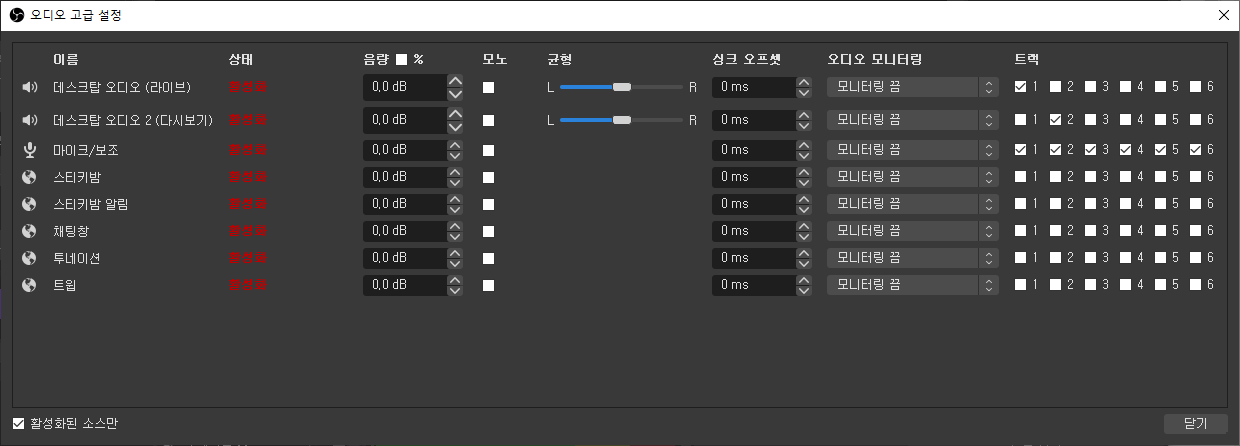 위와 같이 데스크탑 오디오(라이브)는 1번만 체크, 데스크탑 오디오 2(다시 보기)는 2번만 체크, 마이크는 전부 체크해주면 OBS 설정은 끝입니다.