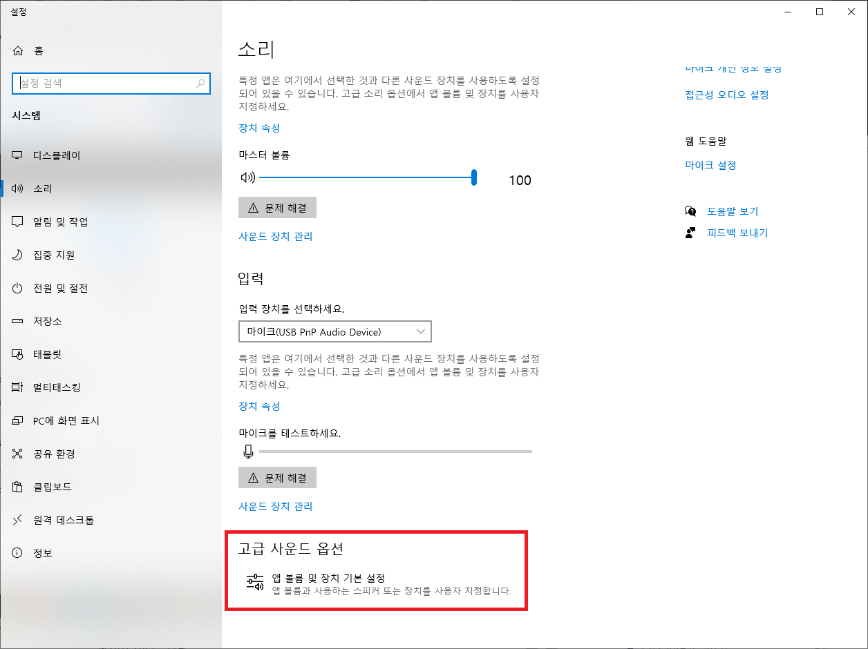 라이브와 다시 보기에 나올 사운드를 설정 및 확인하기 위해 고급 사운드 옵션 "앱 볼륨 및 장치 기본 설정"에 들어가 줍니다.