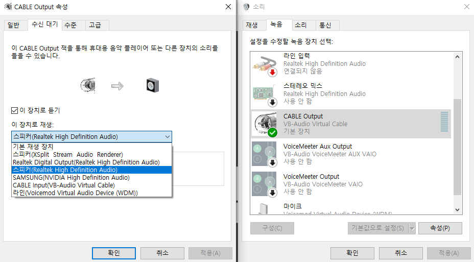 CABLE Output 우클릭 - 속성 - 수신 대기에서 이 장치로 듣기 체크, 이 장치로 재생에서 본인이 사용하는 기본 스피커 선택 (대부분 Realtek High Definition Audio)