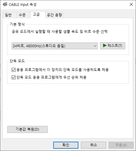 이후 CABLE Input을 우클릭 - 속성 - 고급에서 기본 형식을 24비트 48000Hz로 설정합니다.