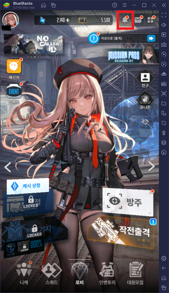 1. 승리의여신 니케를 실행한 후 오른쪽 상단의 종 모양 아이콘(공지사항)을 터치합니다.