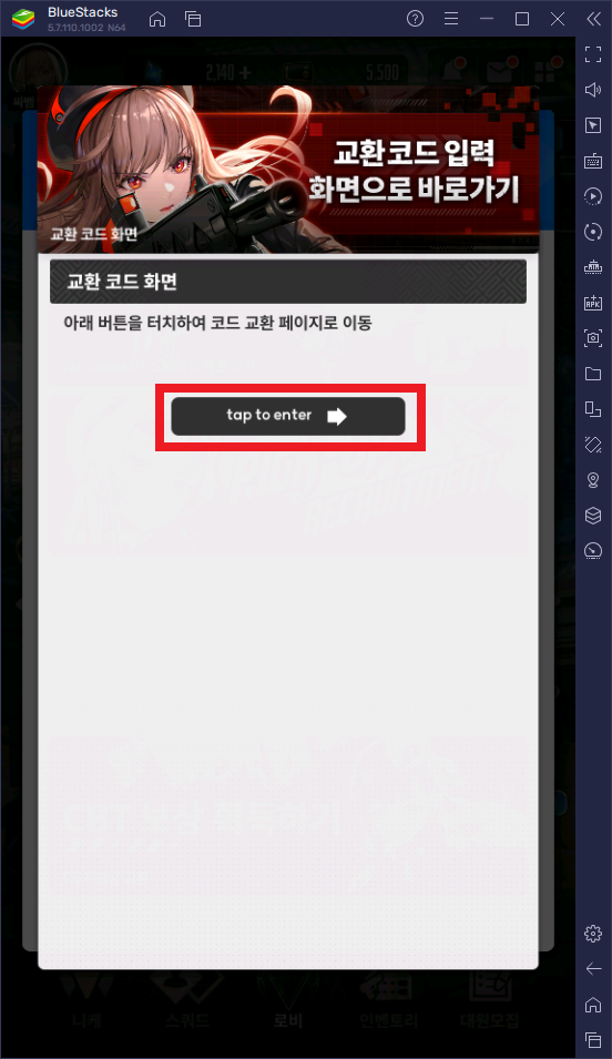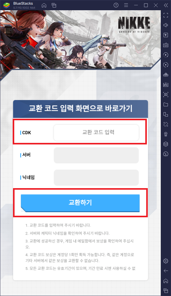 3. 교환 코드 입력 화면에서 CDK에 쿠폰 번호를 입력한 후 교환하기를 눌러줍니다.